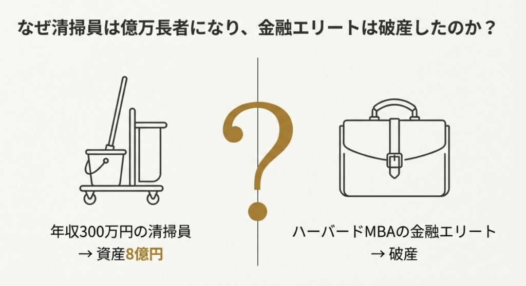 年収300万円の清掃員が8億円の資産を築きました。一方で、ハーバードMBA、高給取りの金融エリートが破産しました。