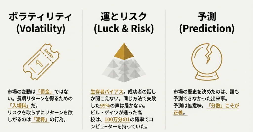 ほとんどの投資家は、このボラティリティを「罰金」だと勘違いしてます。だから、暴落が来ると逃げ出しちゃう。