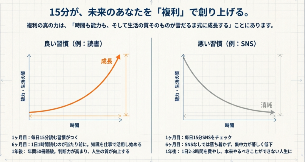 これが複利です。15分は入り口に過ぎません。その小さな習慣が、やがてあなたの人生全体を変えていくんです。