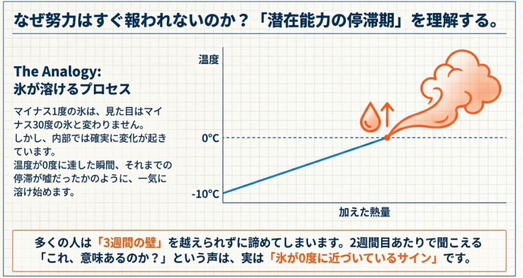 実は、努力の成果はまっすぐには現れないんです。水面下でじっくりとエネルギーを蓄えて、ある一定のラインを超えた瞬間に、急に大きな変化として表れる。それが習慣の特徴です。