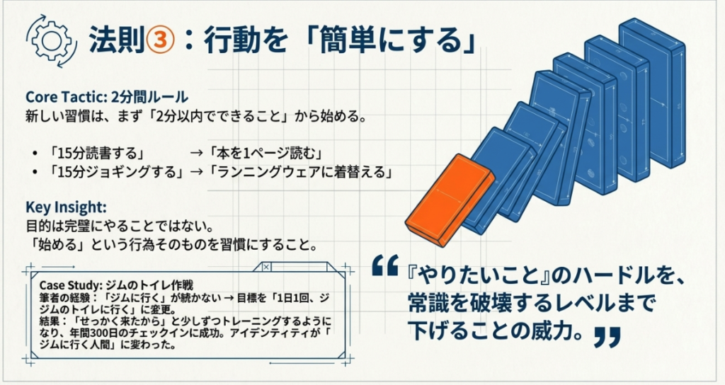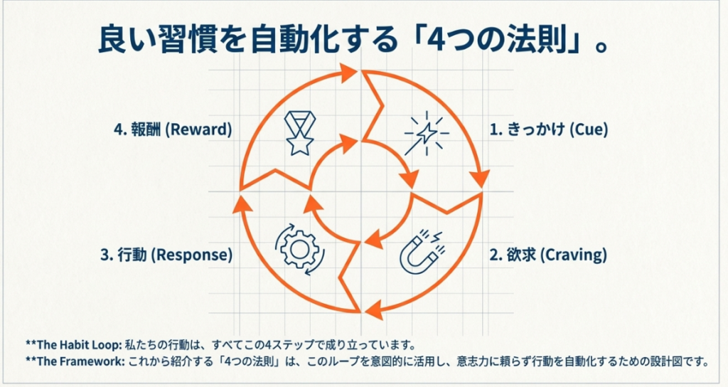 これらの4つのコツは、根性や気合いに頼るのではなく、人間の脳の仕組みを利用して、行動を自動化するための方法です。