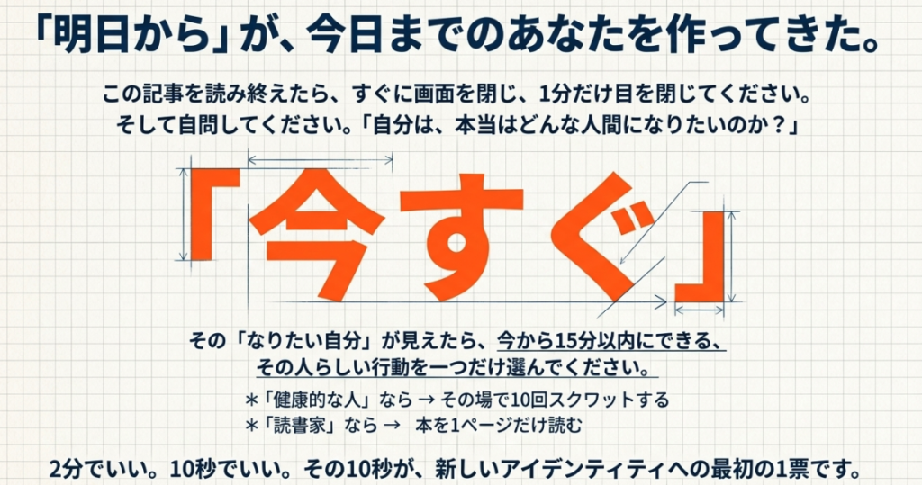 - 「健康的な人」になりたいなら → 今すぐ立ち上がって、その場で10回スクワットをする