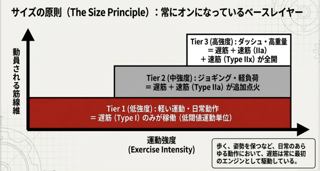 筋線維は運動強度に応じて動員される順番が決まっています(サイズの原則)。遅筋は低閾値運動単位によって支配されており、弱い刺激でも最初に動員されます