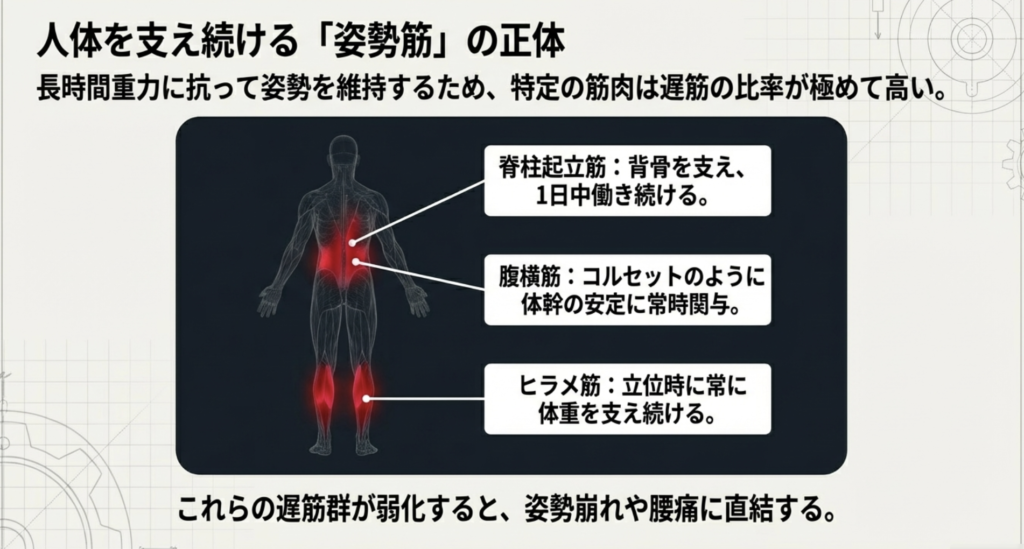 長時間にわたって姿勢を支え続ける筋肉には、遅筋が多く分布しています。