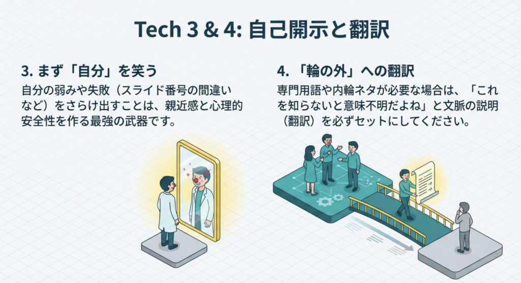 他人を笑いの対象にする前に、まず自分の失敗や弱点を笑いに変える。