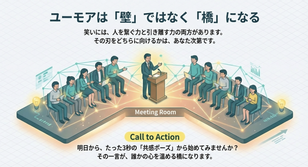 明日、あなたが職場や家庭で何気なく発するユーモアが、誰かの心を温める橋となるか、それとも見えない壁を作るか。