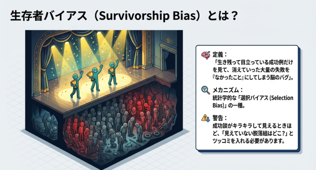 「生き残った成功例だけを見て、消えた失敗例を見落とすせいで、結論が”やたら楽観的”にズレる偏り」です。