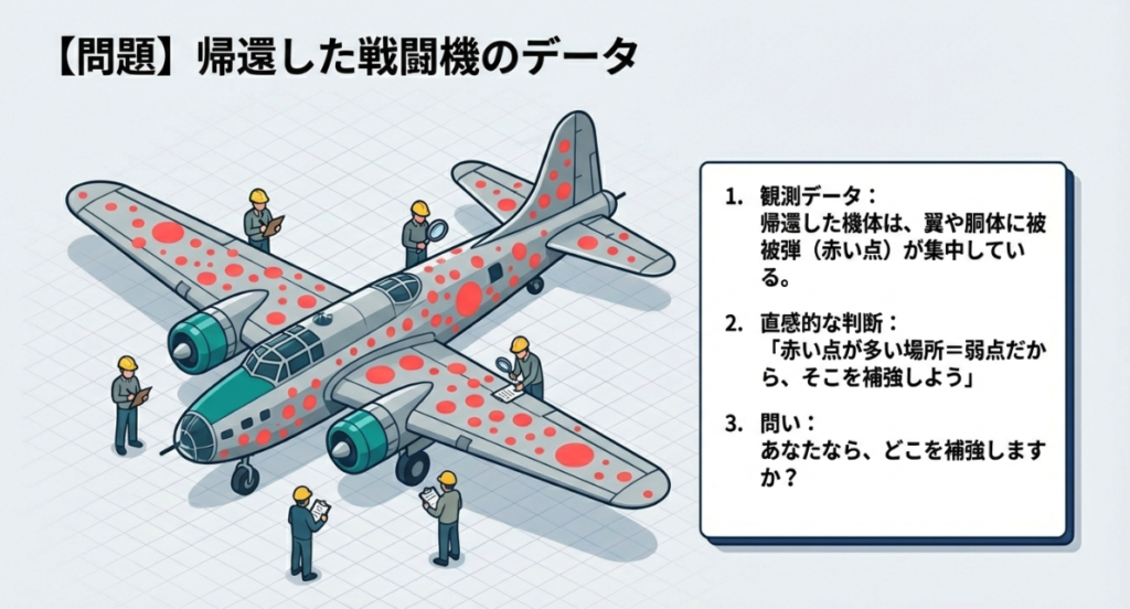 有名な逸話として、第二次世界大戦中に帰還した爆撃機の被弾箇所だけを見て補強を決めそうになったところ、統計学者アブラハム・ワルドが「帰ってこなかった機体(=観測不能な脱落例)を考えるべき」と指摘した話がよく紹介されます。