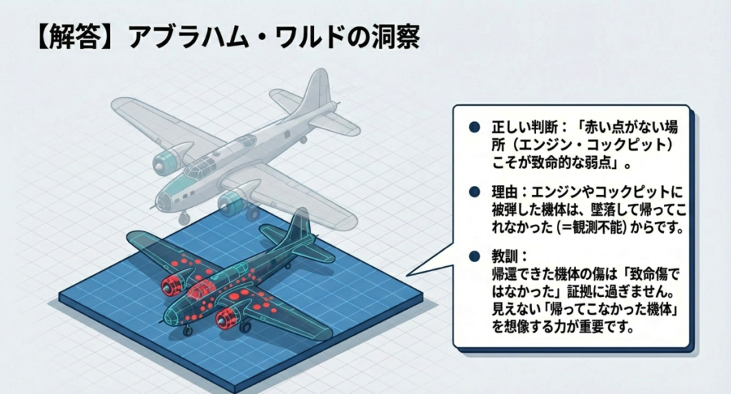 「帰ってきた機体の穴が多い場所=弱い場所」と思いがちですが、帰還できたということは”そこに穴があっても致命傷ではなかった”可能性がある点です。観測できない”帰ってこなかった機体”を想像して逆を考えるのが要点です。