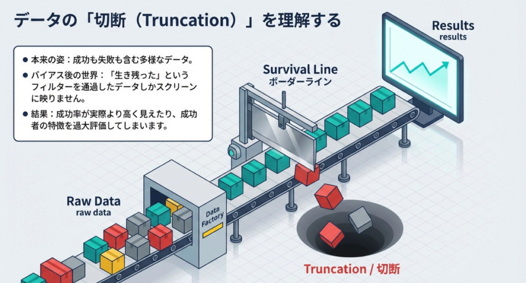 生存者バイアスは、データが特定のライン(切断点)で切られることで起きます。