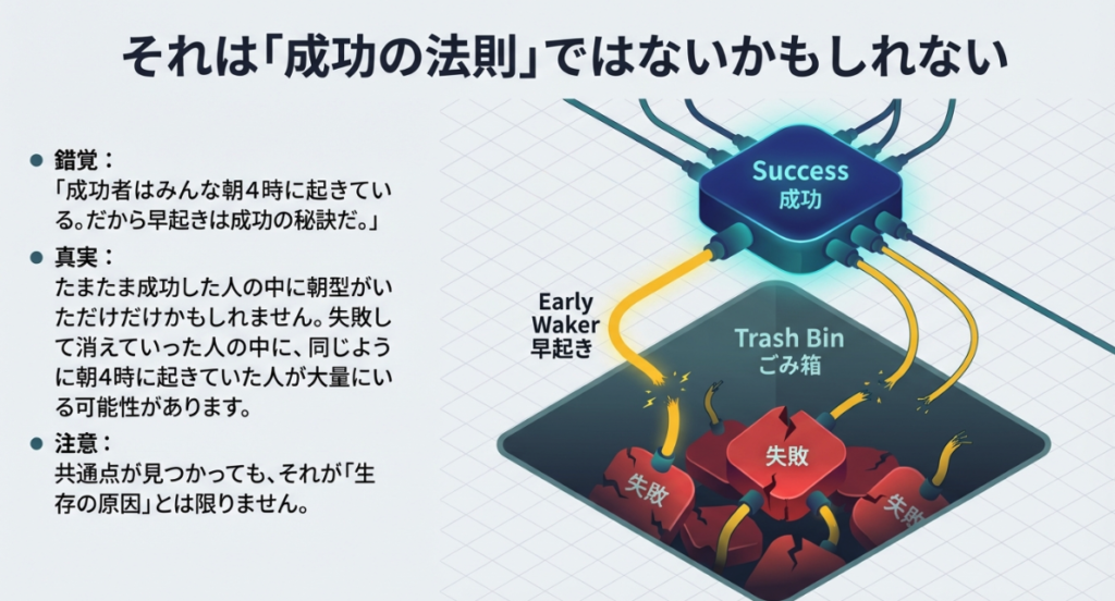 • 相関が歪んだり、成功者の特異な共通点(例:朝4時に起きる)が「必須条件」のように過大評価される