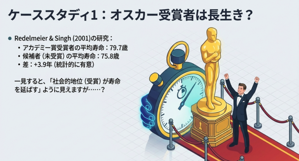 一見すると「受賞(高い地位)=長寿」に見えますが、観察研究なので「健康・生活習慣・社会経済的資源・仕事量」などの交絡や、後述の不死時間バイアスで”有利に見える”可能性があります。心理学検定的には、「因果(受賞が寿命を延ばす)」ではなく、まずは関連(association)として読むのが安全です。