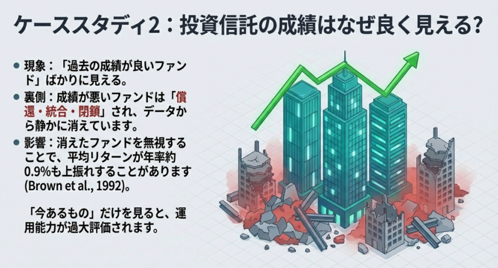 投資信託は成績が悪いと償還・統合・閉鎖でデータから消えやすく、残ったファンドだけで平均を取ると成績が上振れします。