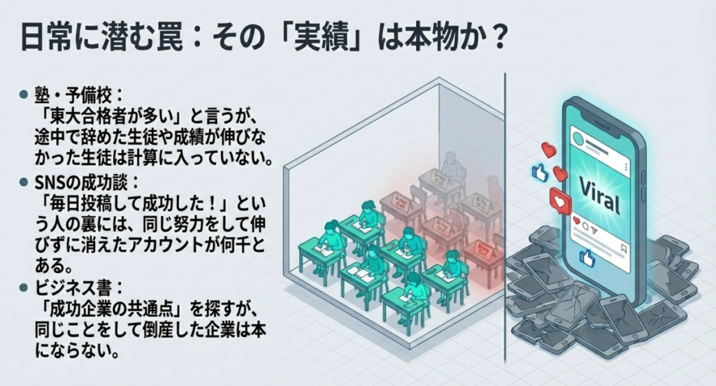 「この塾は東大合格者が多いけど、途中で辞めた生徒を入れると評価が変わるかもしれない。これは生存者バイアスだよ。」