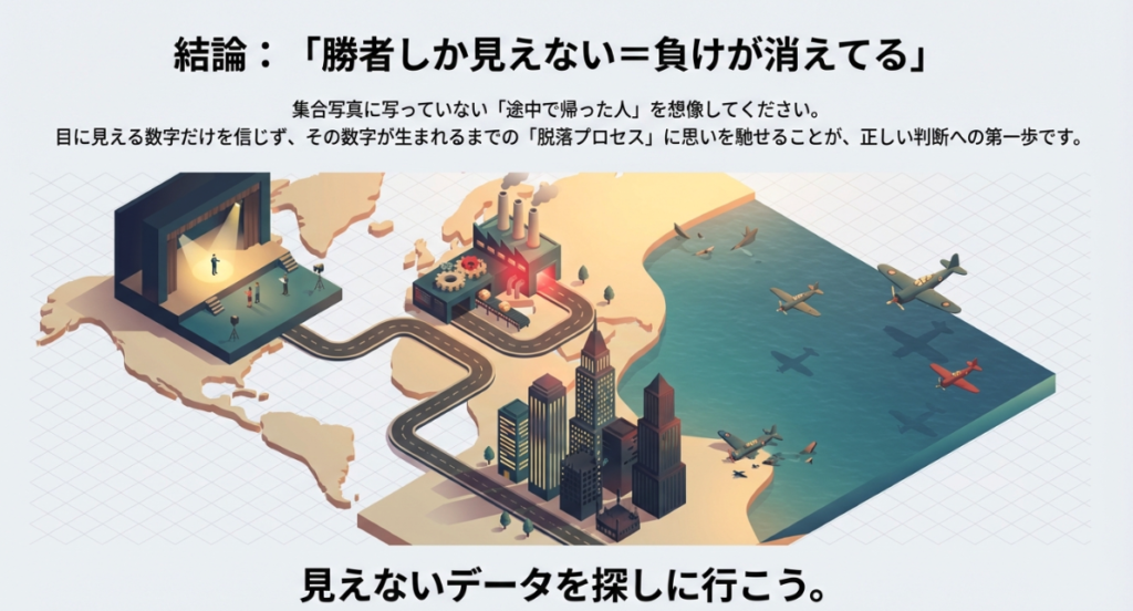 つまり、**「目に見える数字だけを信じるな、その数字が生まれるまでの『脱落プロセス』を想像せよ」**というのが、これら全ての論文に共通する教訓です。