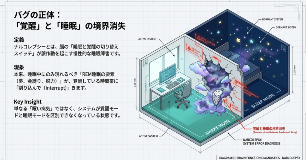 イメージ図:脳内に「覚醒スイッチ(オレキシン)」があるが、そのスイッチが壊れて(85〜95%消失)、眠りと覚醒の境界が曖昧になり、REM睡眠の要素(夢、筋肉の脱力、金縛り)が起きている時間に侵入してくる