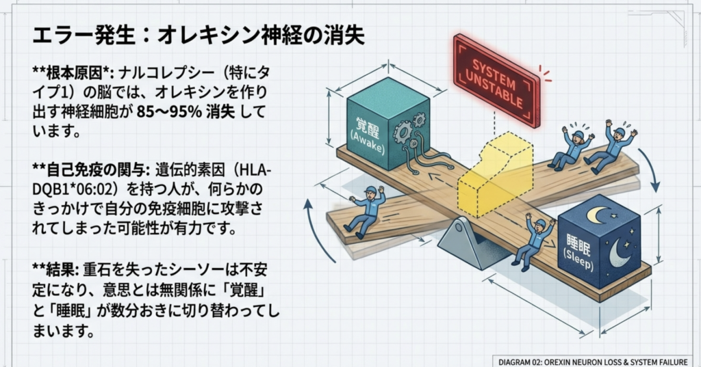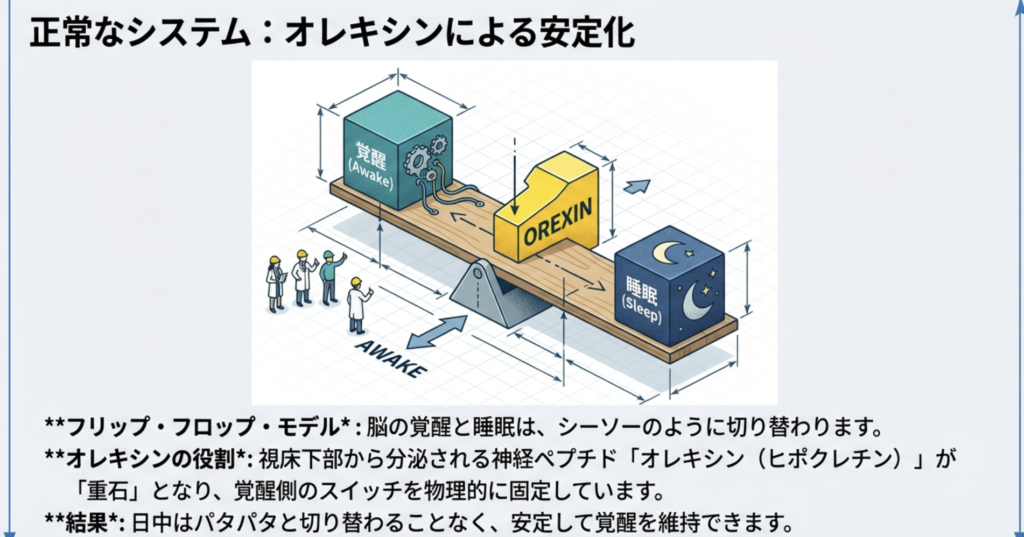オレキシン神経が消失することで、この「重石」がなくなり、シーソーが不安定に揺れ動きます。結果として、数分おきに覚醒と睡眠が切り替わってしまうことが、日中の強い眠気の正体です。