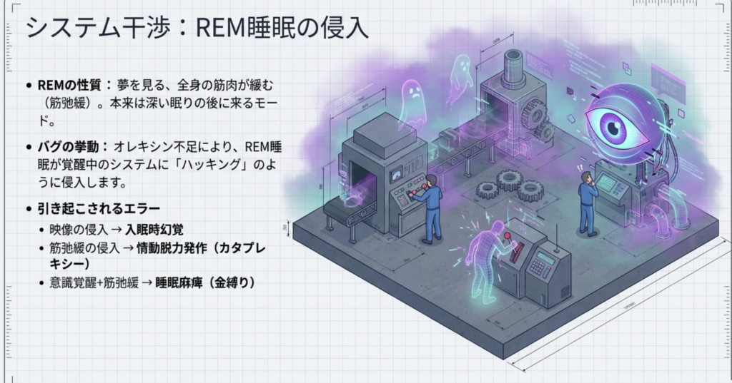 また、このシーソーが不安定なために、本来は睡眠中にだけ出現すべきREM睡眠の要素(夢、筋弛緩)が、覚醒時間に「漏れ出て」しまいます。これがカタプレキシーや入眠時幻覚として現れます。