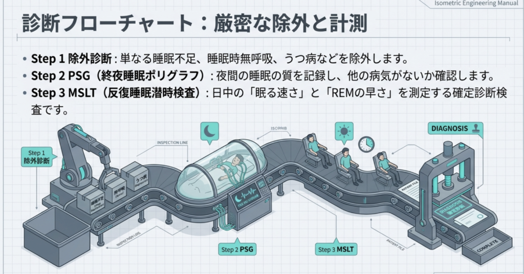 このように、ナルコレプシーの診断は段階的な除外と客観的検査の組み合わせで行われます。