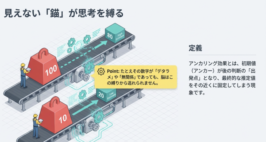 - アンカーの数字を見る→その数字に近い値や関連概念が活性化(プライミング)→推定がアンカー方向へ偏る