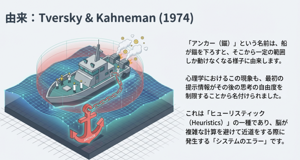 アンカリング効果という名前の由来は、Tversky & Kahneman(1974)が示した「アンカー(錨:いかり)」という比喩から来ています。船が錨を下ろすと動きが制限されるように、最初に提示された数字がその後の推定を”固定”してしまう、という発想です。