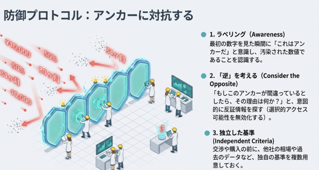 - **応用:**交渉で相手の最初の提示に反論するとき、数字だけでなく、相手が誘発した「理由の探索」を断つ(別基準・別次元に切り替える)ことが重要