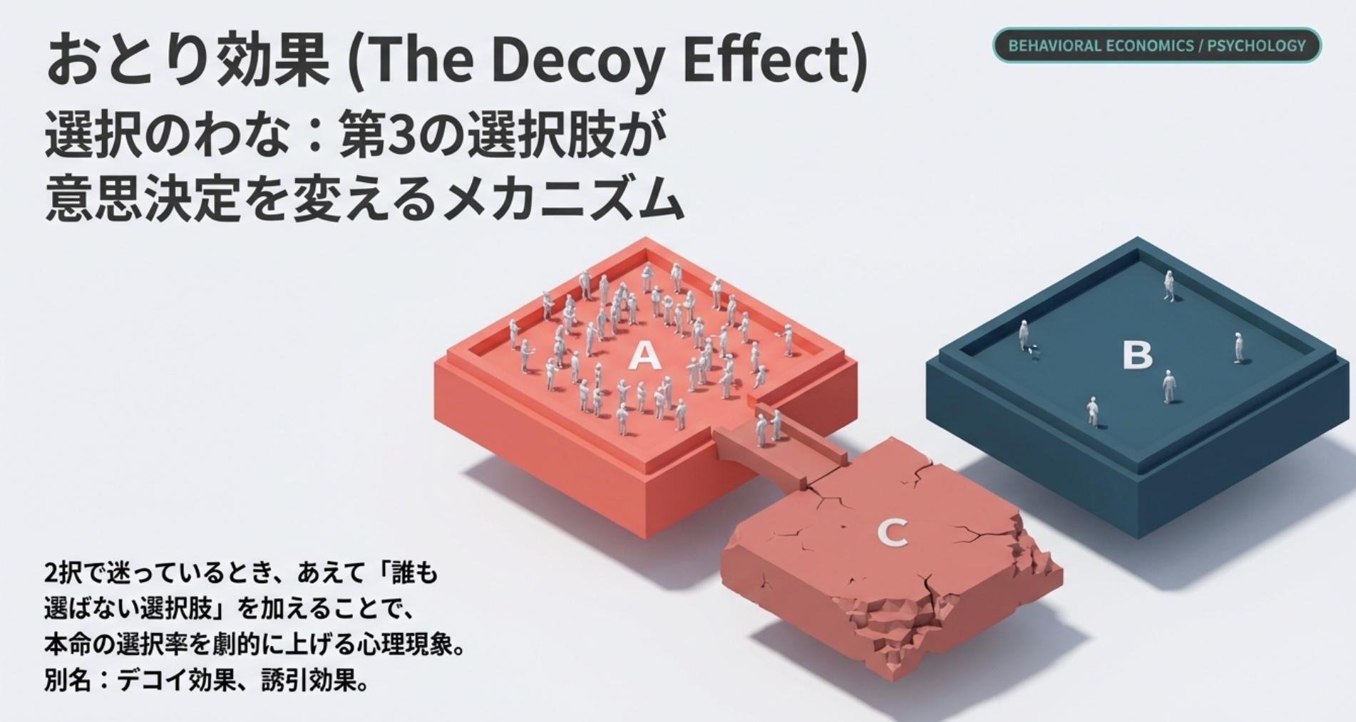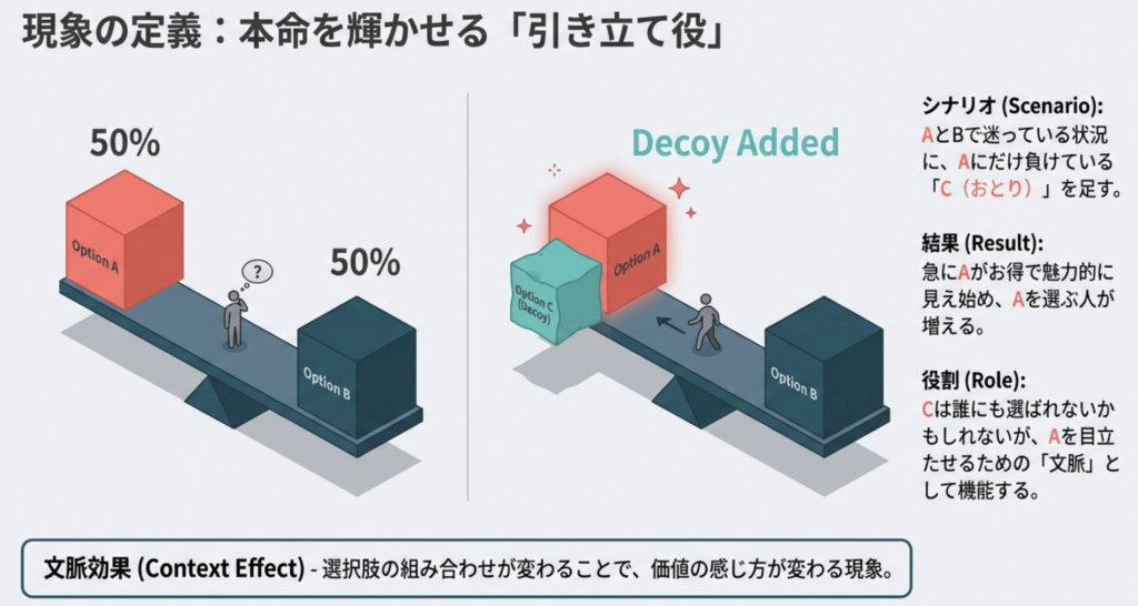 「わざと微妙な第3の選択肢(おとり)を混ぜると、本命を選びやすくなる現象」です。