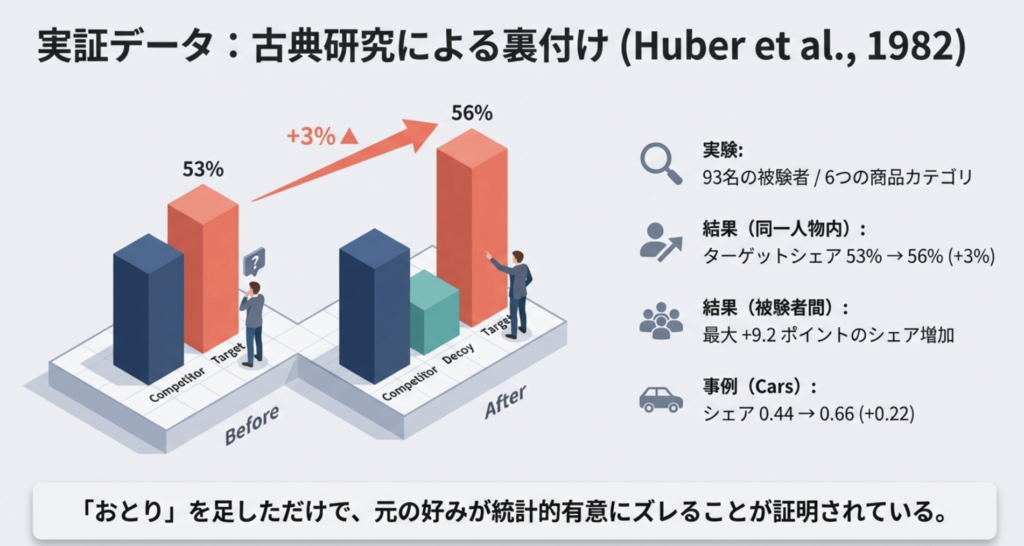 結論: “おとり”を足しただけで、元の2択の好みがズレることが、実験的に示されています。