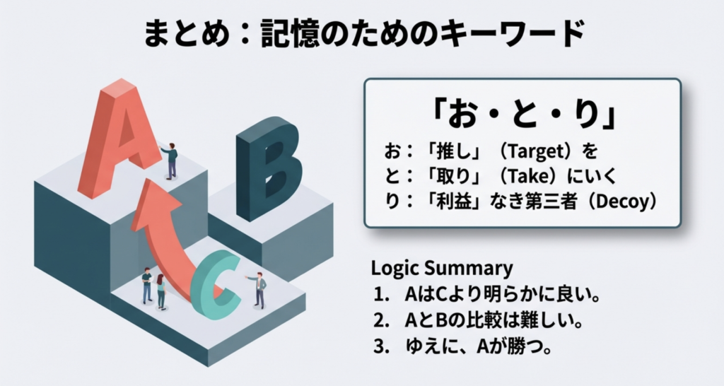「AとBで迷ってるときに、**Aにだけ負けてる”C(おとり)”**を足すと、Aが急に良く見えて、Aを選ぶ人が増えることがあるんだ。Cは誰も選ばないこともあるけど、Aを目立たせる役になるんだよ。」