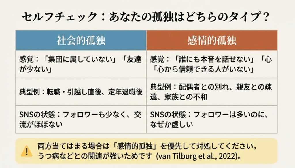 両方当てはまることも珍しくありません。その場合は、感情的孤独を優先して解消することが研究では推奨されています(van Tilburg et al., 2022)。感情的孤独の方がうつ病との直接的な関連が強いためです。