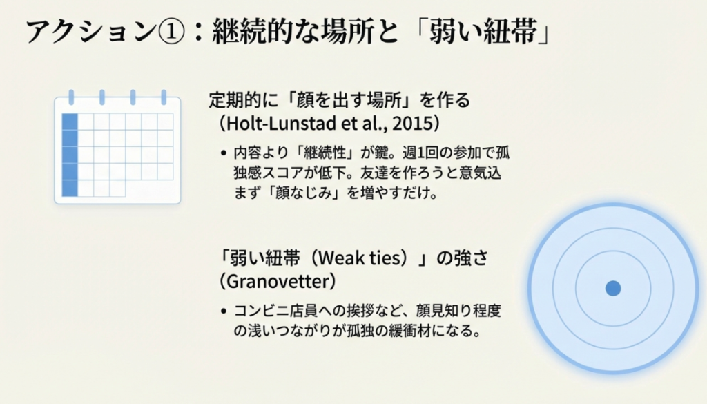 社会学者Granovetterが提唱した「弱い紐帯の強さ」理論によれば、深い関係よりも、近所の人や顔見知り程度の浅いつながり(Weak ties)が社会的孤独の緩衝材になります。コンビニ店員への一言、エレベーターでの挨拶——そういった小さな接触の積み重ねが、孤独感を和らげる効果があります。