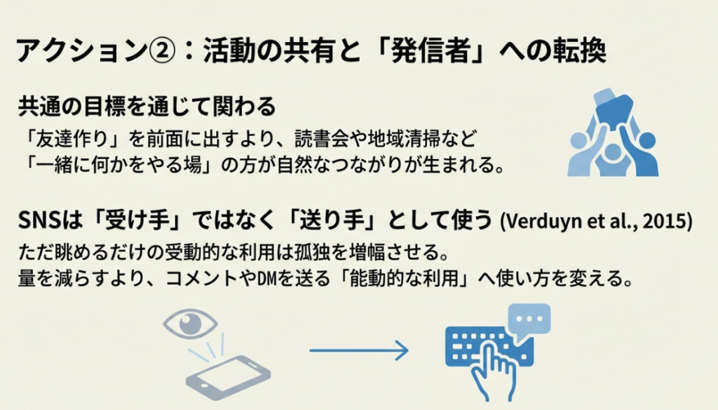 SNSをただ眺めるだけの「受動的な使用」は孤独感を増幅させますが、コメントやDMを送る「能動的な使用」は孤独感を緩和するという研究結果があります(Verduyn et al., 2015)。量を減らすより、使い方を変える方が現実的で効果的です。