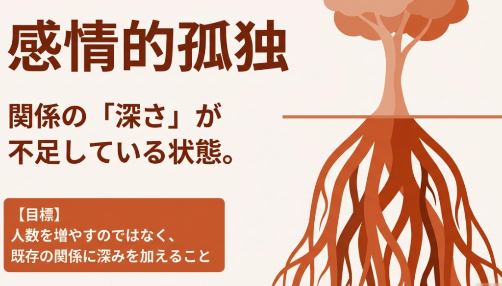 感情的孤独は「関係の深さ」に関わる孤独です。人数を増やすよりも、既存の関係に深みを加えるアプローチが効果的です。