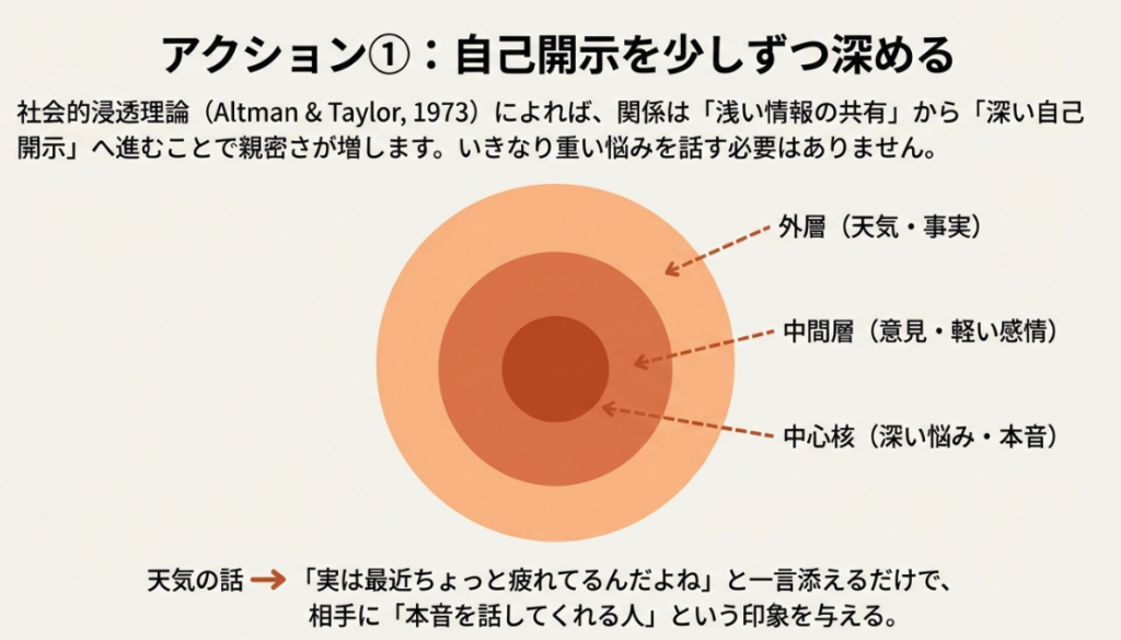 社会的浸透理論(Altman & Taylor, 1973)によれば、人間関係は浅い情報の共有から始まり、徐々に深い自己開示へと進むことで親密さが増します。