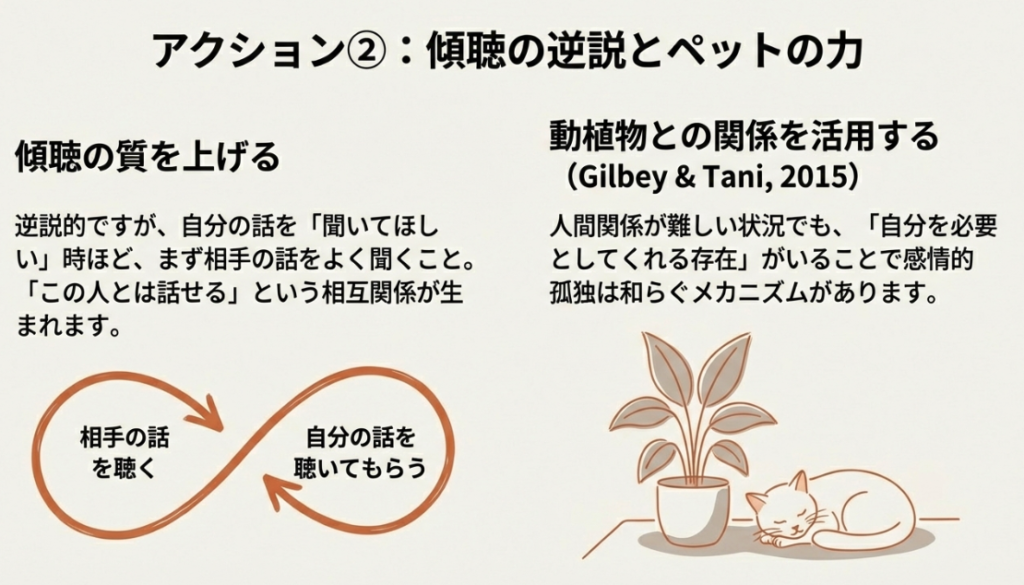 感情的孤独を感じている人は「話を聞いてもらえていない」感覚が強い傾向があります。逆説的ですが、自分が相手の話をよく聞くことで「この人とは話せる」という関係が生まれ、相手からも聞いてもらいやすくなります。