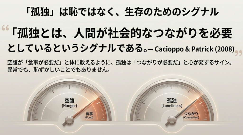 孤独とは、人間が社会的なつながりを必要としているというシグナルである。 — Cacioppo & Patrick(2008)