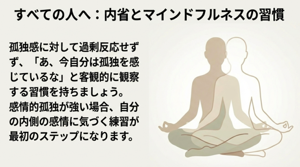 | どちらにも効く | 孤独を恥じない/感情を観察する習慣をつける |