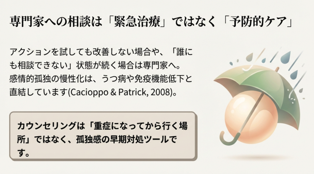 感情的孤独が慢性化すると、うつ病や免疫機能低下との関連が報告されています(Cacioppo & Patrick, 2008)。カウンセリングは「重症になってから行く場所」ではなく、孤独感の早期対処に使えるツールです。「まだそこまでじゃない」と思っているうちに活用することが、長期的な心の健康につながります。