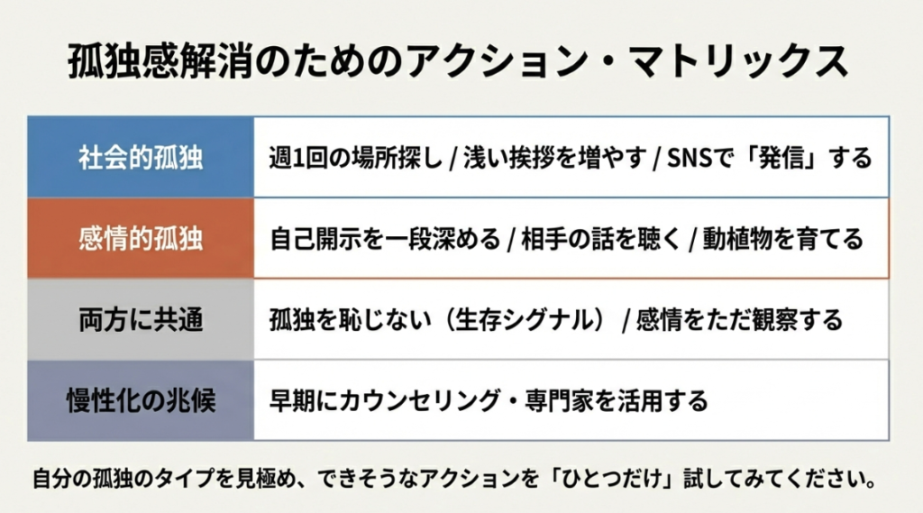 まず自分の孤独がどちらのタイプかを見極め、できそうなアクションをひとつだけ試してみてください。すべてを一度に変える必要はありません。
